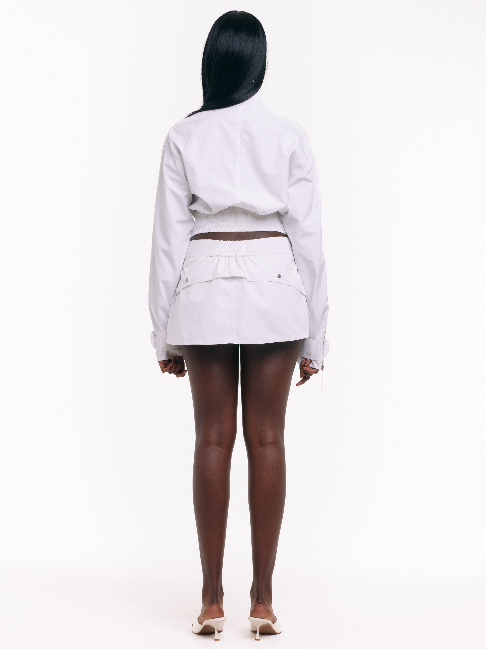 The Blanca Zip Jacket in White. Made from soft-touch, high-quality, waterproof Nylon. Featuring an asymmetric zip fastening and a neck to cuff two-way zip, for added versatility. Finished with embroidered logo detailing. Pair with the Blanca Zip Skort in White.