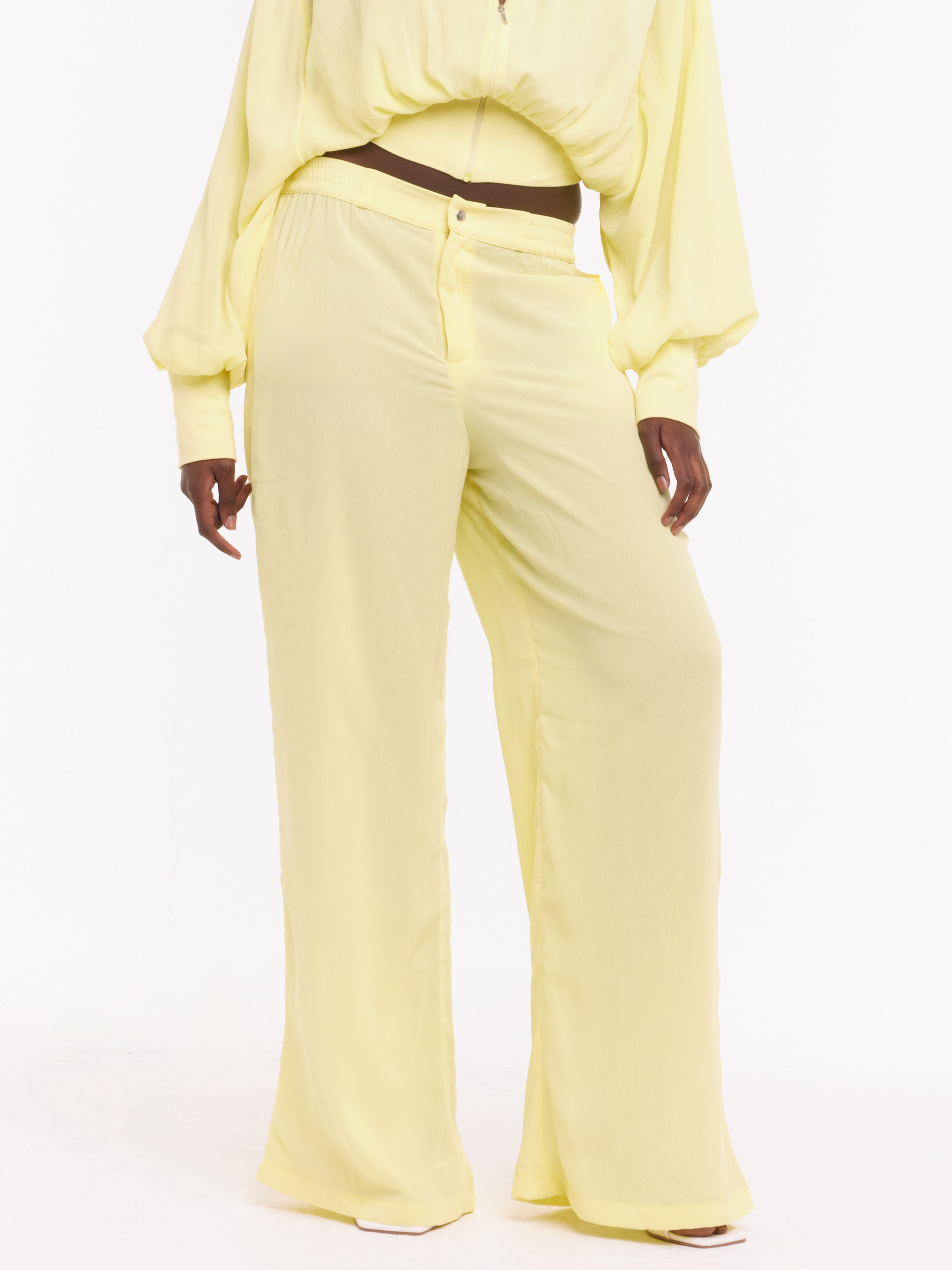 The Icona Pants in Canary Yellow. Made from a high-quality, semi-pleated, Chiffon fabric. Wide leg fit, puddle shaped hem with elasticated waistband. Back pockets. Fully lined. Pair with the Icona Shirt in Canary Yellow.