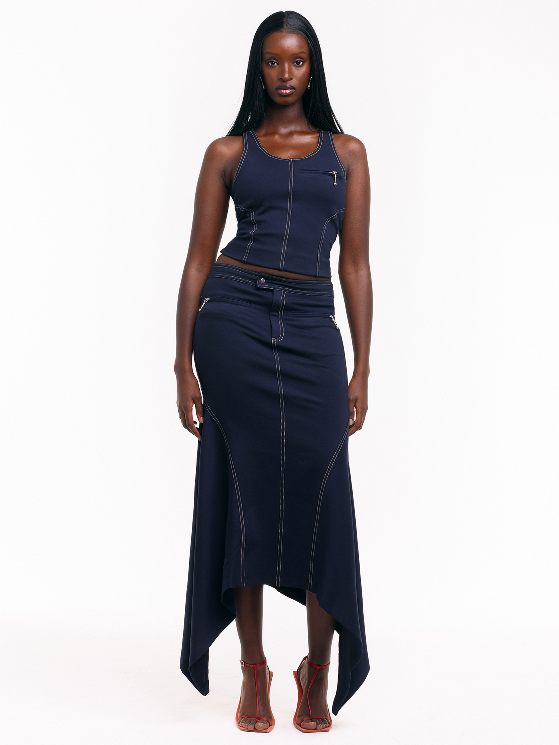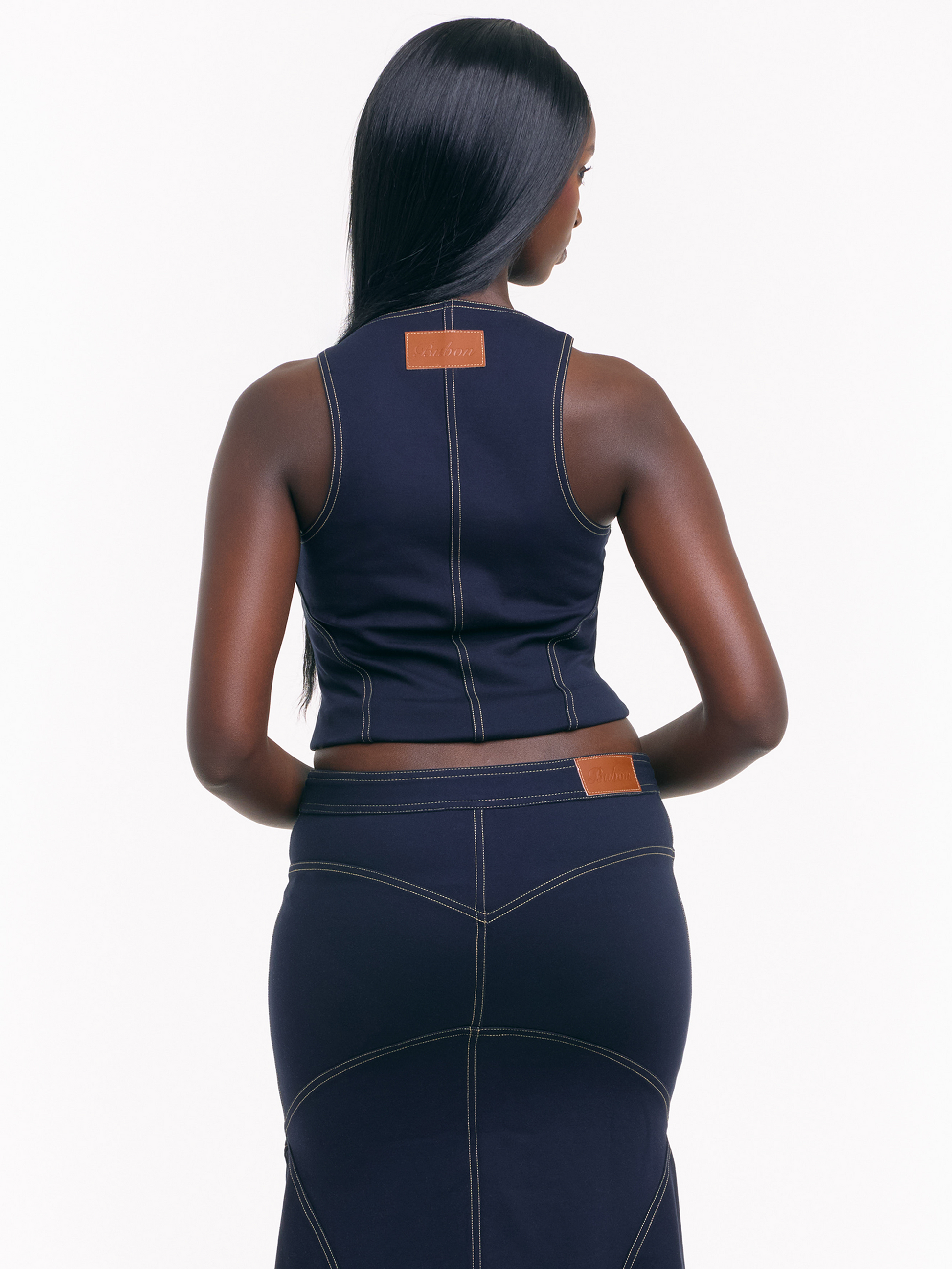 The Jeen Knit Tank in Classic Navy. Made from a high-quality, double-knit stretch fabric. Tailored fit, classic denim jacket twinstitch detailing and a zipped pocket. Leather logo patch on back. Pair with the Jeen Knit Skirt or Jeen Knit Pants in Classic Navy .
