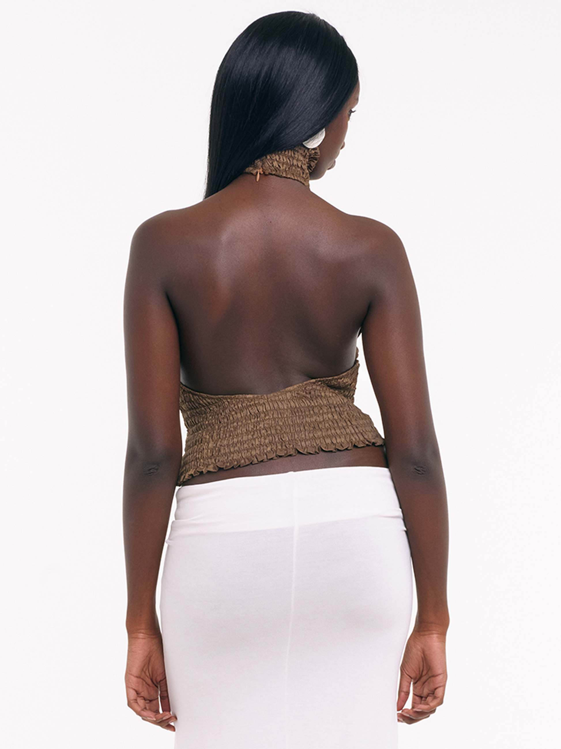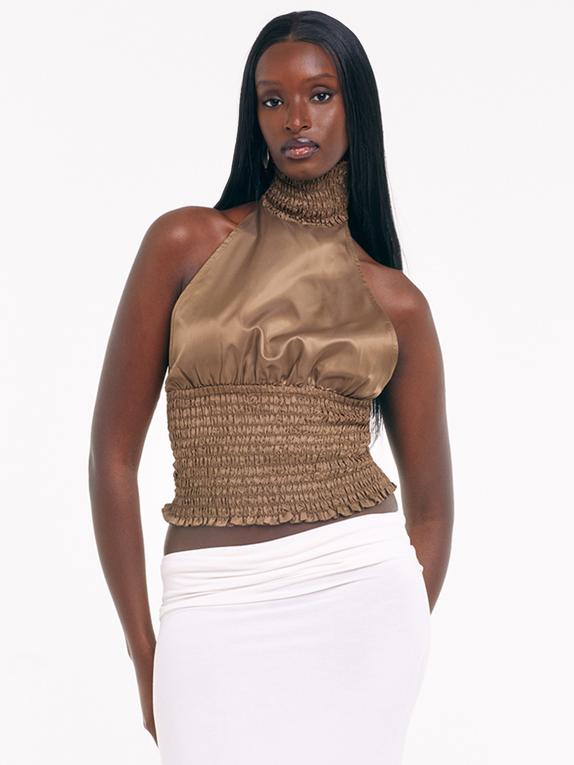 The Oil Shirred Top in Vintage Khaki. Made from a high-quality, buttery Nylon fabric. Tailored fit, shirred detailing around neck and body. Low V-shape back cut with zip fastening at back of neck. Lightweight, designed to accentuate.