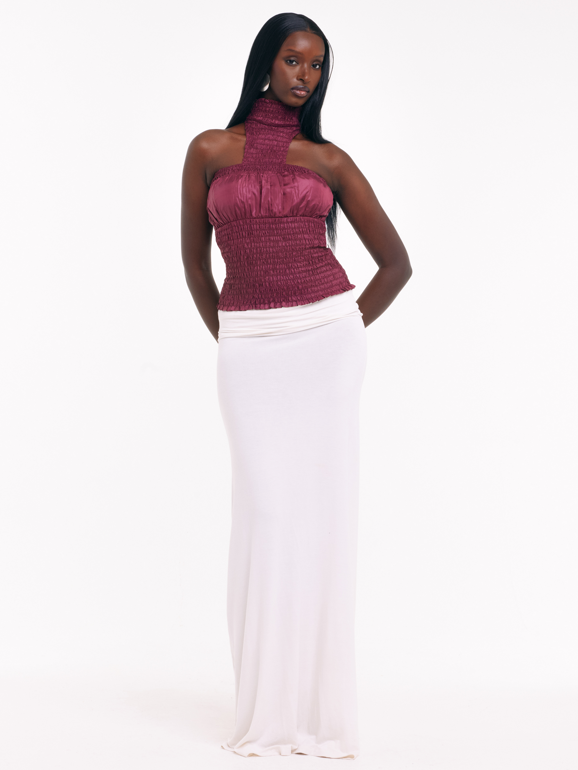 The Oil Shirred Top in Wine Red. Made from a high-quality, buttery Nylon fabric. Tailored fit, shirred detailing around neck and body. Zip fastening at back. Lightweight, designed to accentuate.