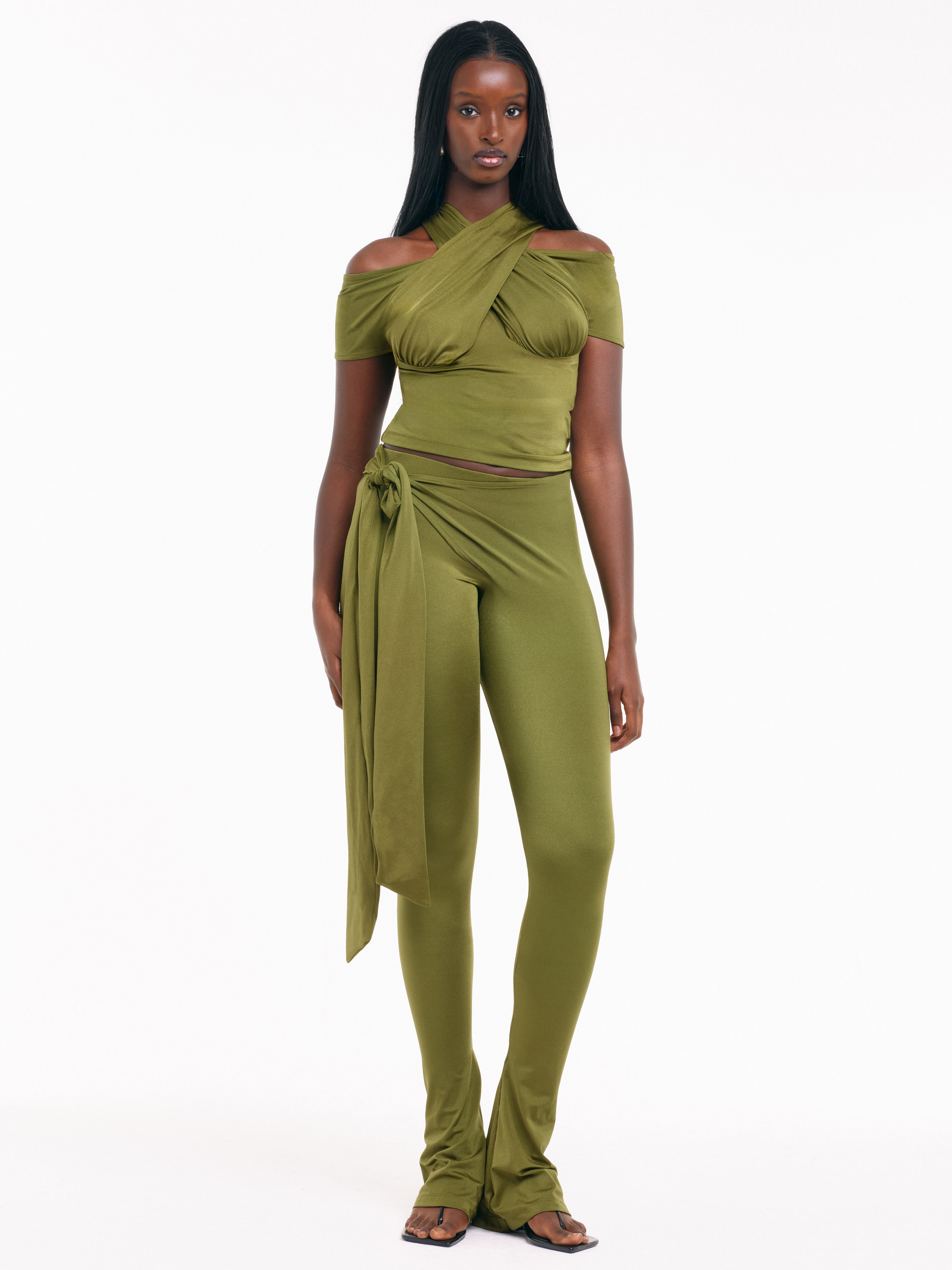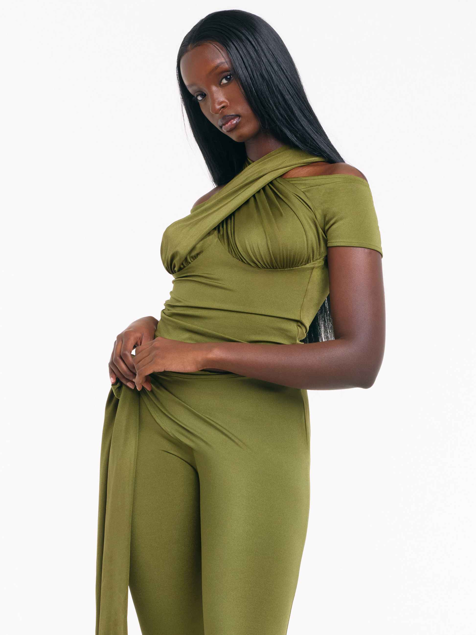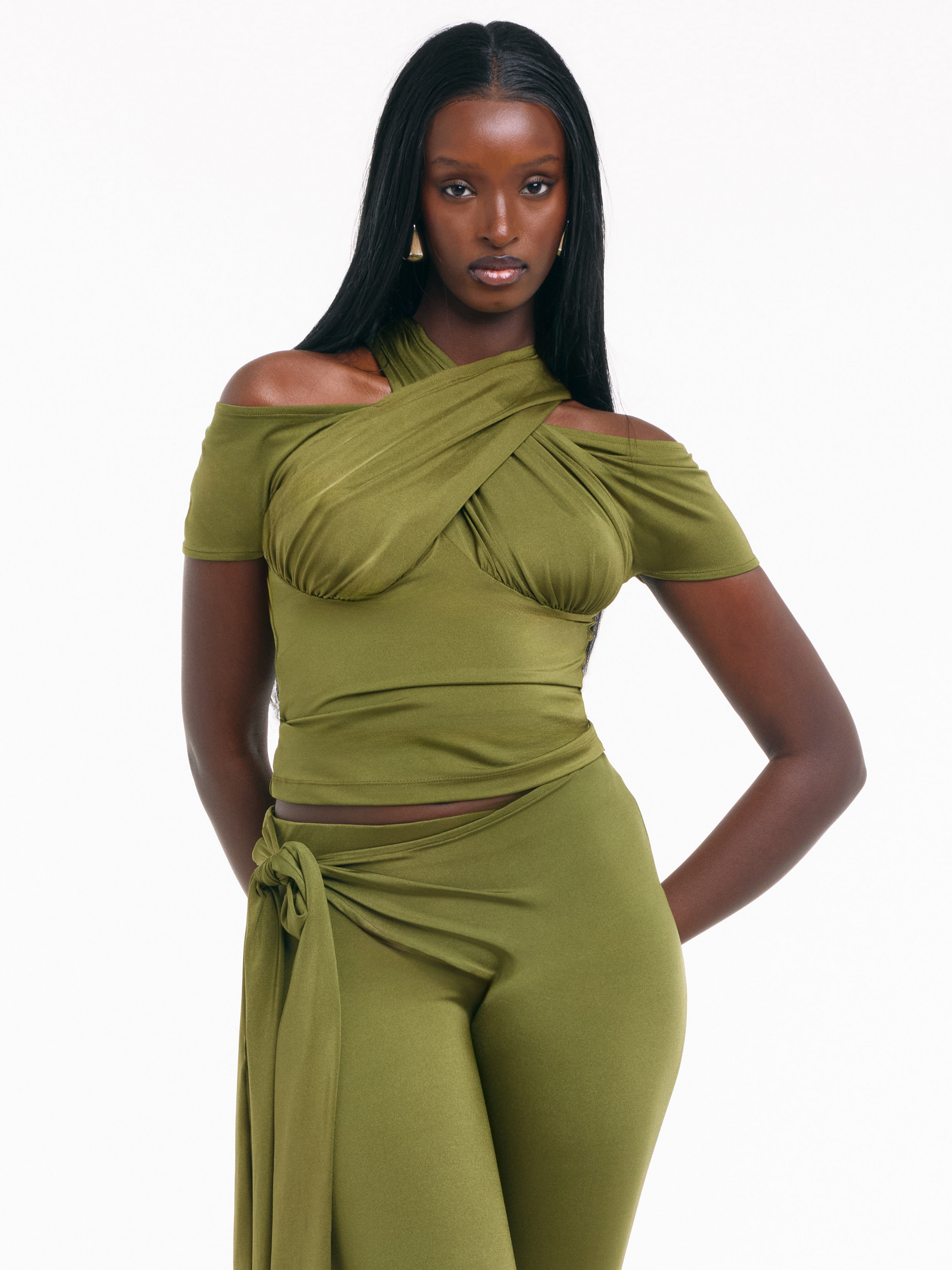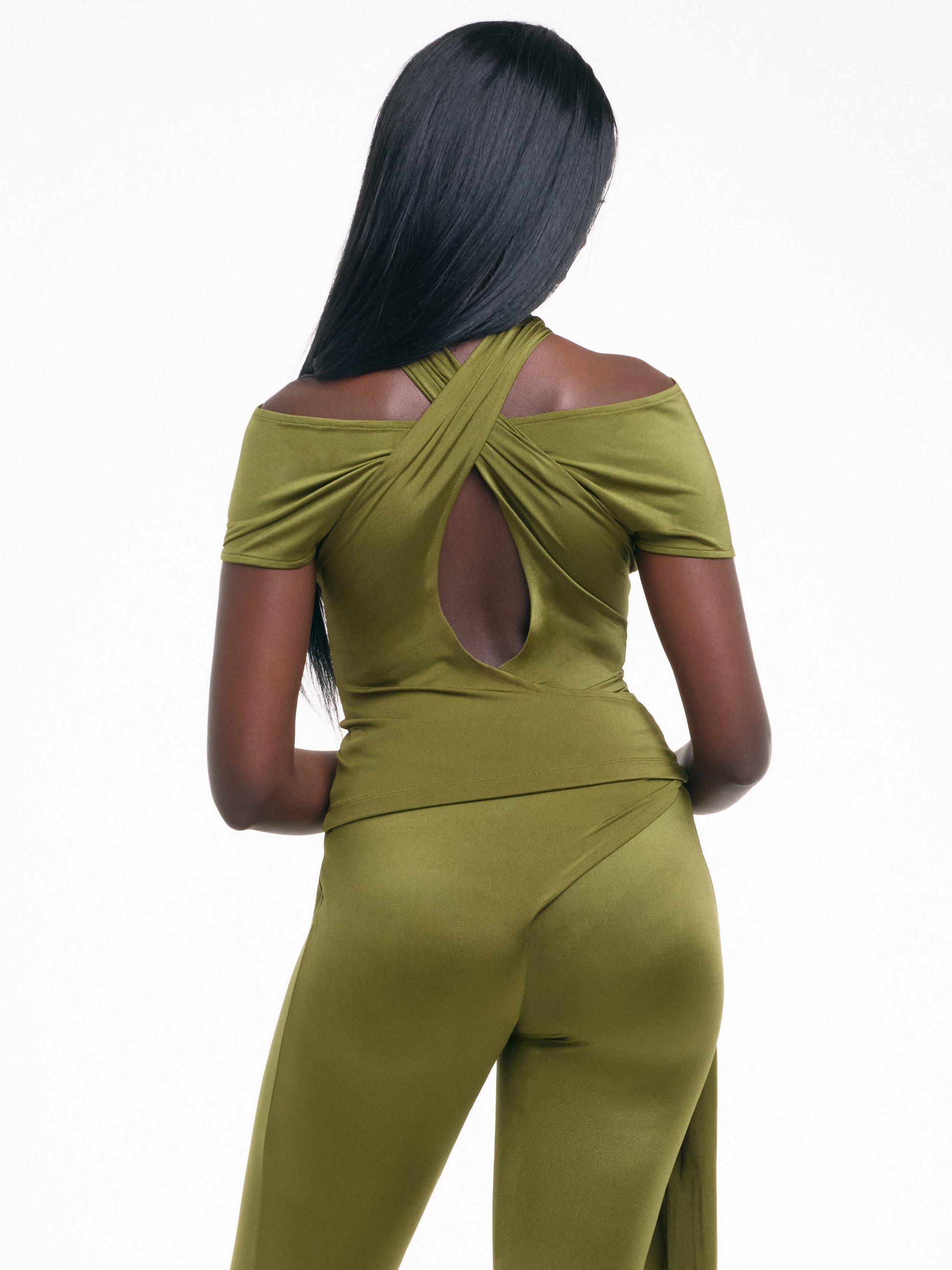 The Origami Top in Olive. Made from a high-quality, double-knit stretch Nylon-Jersey fabric. Adjustable neckline for a versatile asymmetric look. Back keyhole detail with off-shoulder short sleeves. Pair with the Origami Tie Pants in Olive.